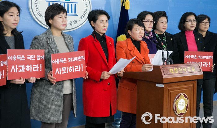 (서울=포커스뉴스) 14일 오전 서울 여의도 국회 정론관에서 새누리당 전국여성의원협의회 소속 회원들이 박근혜 대통령 비하 막말 논란을 받고 있는 이용득 새정치민주연합 최고위원의 사퇴 및 징계 촉구 기자회견을 하고 있다.