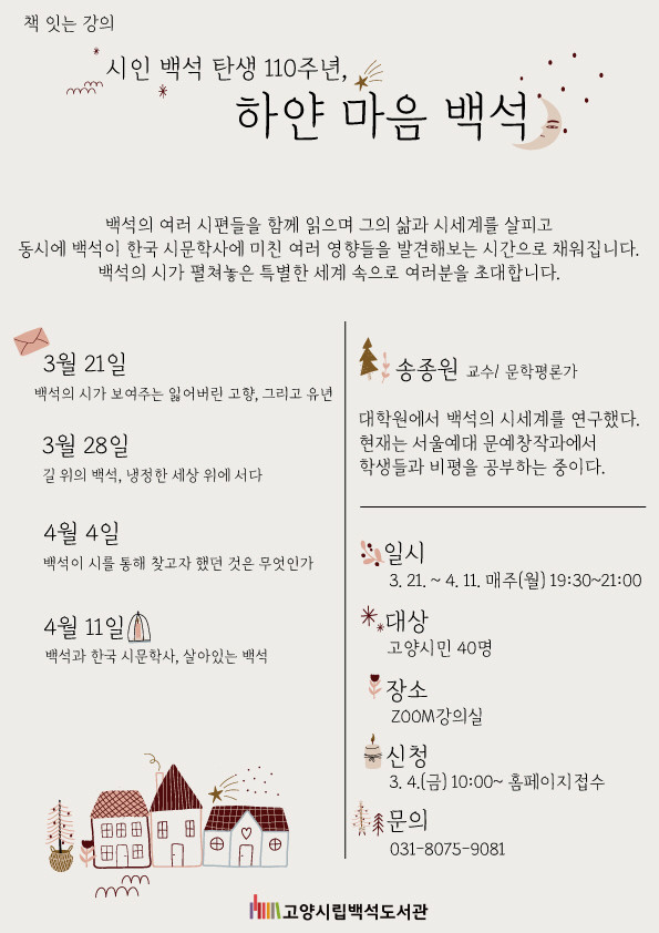 프로그램은 줌(Zoom)을 활용한 비대면 강의로 진행되며 신청은 3월 4일(금) 오전 10시부터 고양시도서관센터 홈페이지를 통해서 할 수 있다. 선착순 40명을 모집한다.