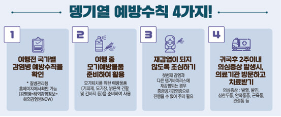 해외여행을 계획 중이라면 여행 전 질병관리청 홈페이지에서 국가별 감염병 예방정보를 꼭 확인해야 한다. 특히 뎅기열 위험 국가에서 모기에 물린 후 2주 이내에 발열, 두통, 근육통 등 의심 증상이 나타날 경우 의료기관을 찾아 해외여행 이력을 알리고 신속히 진단과 치료를 받아야 한다.