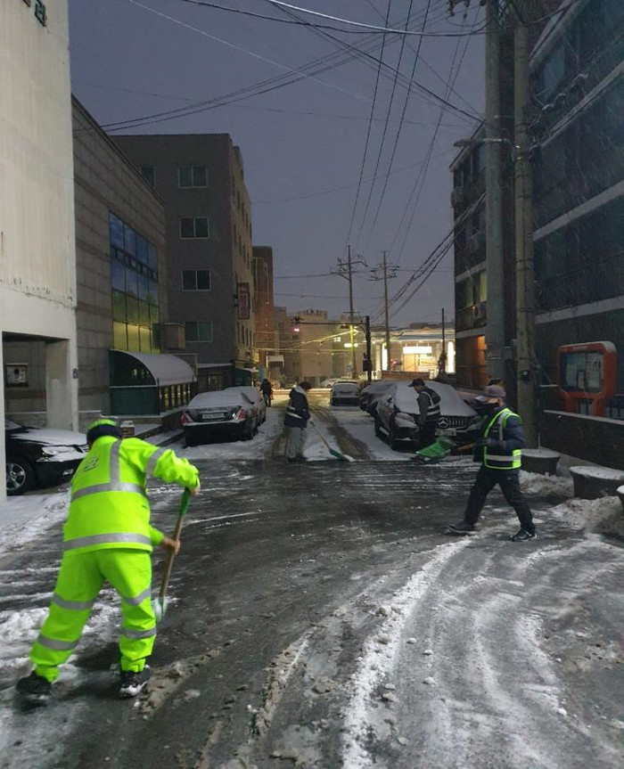 이날 학생 통학로로 이용되는 이면도로와 마을 안쪽 그늘진 곳, 급경사가 심한 곳 등 취약지구를 중심으로 집중적으로 제설 작업이 이뤄졌다. 또한 도로 및 마을 안길 등은 제설차량을 최소 10차례 이상 반복 운행해 염화칼슘을 살포했다.