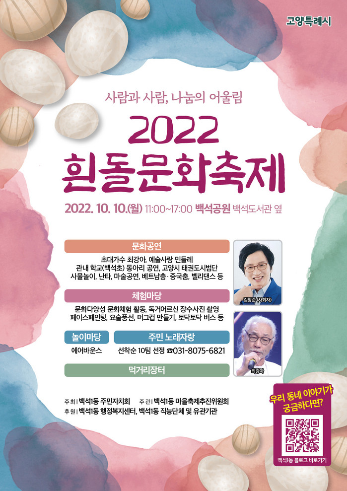 [부자동네타임즈 김인수기자] 고양특례시 일산동구 백석1동 마을축제 추진위원회(위원장 이석구)는 오는 10일 ‘2022 흰돌문화축제’를 개최한다고 밝혔다.