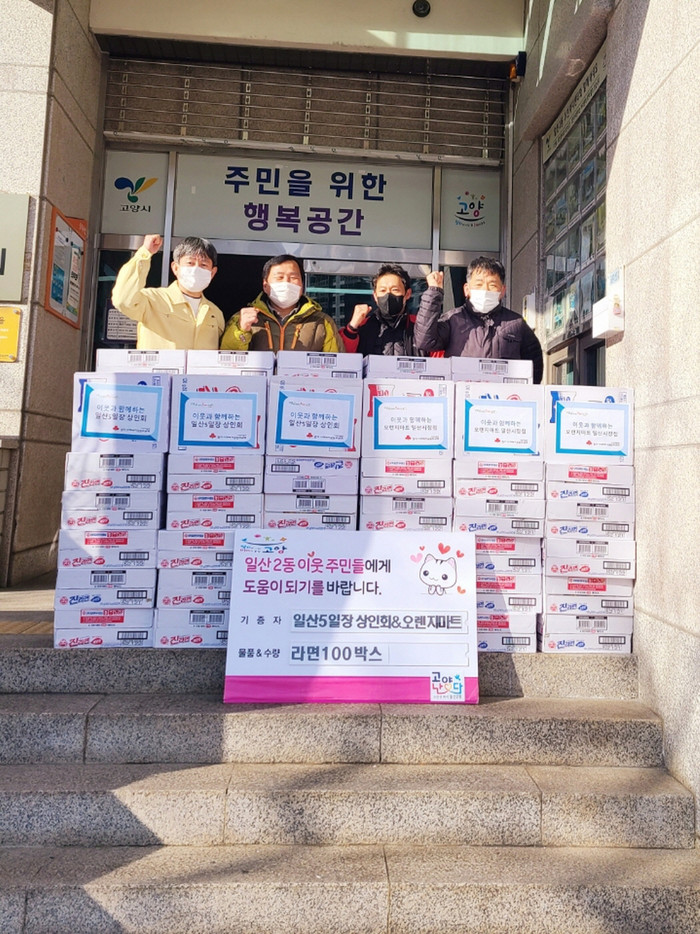 [부자동네타임즈 김인수기자] 고양시 일산서구 일산2동 행정복지센터(동장 백진규)는 지난 13일 일산5일장 상인회 및 오렌지마트 일산시장점으로부터 라면 100박스를 전달받았다.