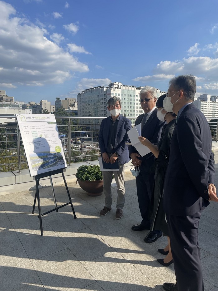 [사진설명] 오바이스 샤마드 부총장이 일산서구청 옥상에서 벽면녹화 사업에 대한 설명을 듣고 있다.