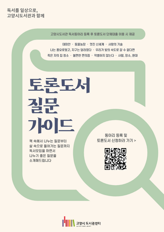 [부자동네타임즈 김인수기자] 고양시 도서관에서 4월부터 고양시도서관 등록 독서동아리가 토론도서 단체대출을 이용할 때 질문가이드를 제공한다.