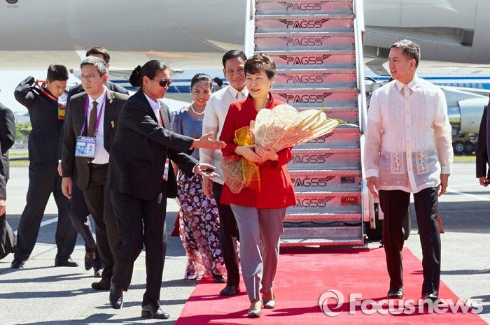 | △ 박근혜 대통령이 18일 오전(현지시간) 캐나다, 필리핀 정상과의 양자회담으로 공식 일정을 시작했다. 사진은 17일 필리핀 마닐라에 도착한 박 대통령. <사진출처=청와대> |