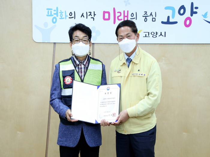 시상식은 코로나19 상황을 고려해 지난 17일 고양시청에서 이재준 고양시장, 김천만 고양시 시민안전지킴이 연합대장 등 최소 인원만 참석해 진행됐다.