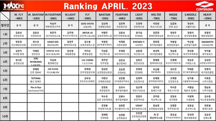 [부자동네타임즈 김인수기자] 지난 3월 11일에 열린 ‘MAXFC 컨텐더리그 21 IN 대구’ 대회와 ‘퍼스트리그 24 IN 익산’ 대회가 성공적으로 개최되면서 MAXFC 랭킹에도 많은 변화가 있었다. 전체 체급에서 총 15명의 랭킹 상승과 진입이 이루어졌다.