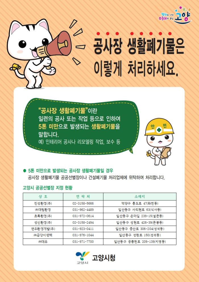 고양시 자원순환과 폐기물관리팀장은“시민들의 작은 노력과 실천들이 모이면 쓰레기 처리 비용이 절감되고 환경 개선에도 큰 도움이 될 것”이라며 “앞으로 관내에서 발생하는 공사장 생활폐기물을 효율적으로 처리하기 위해 노력할 것”이라고 밝혔다.