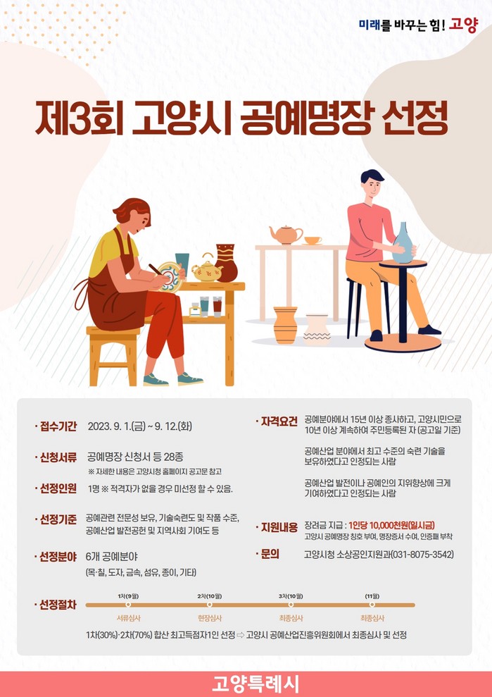 [부자동네타임즈 김인수기자] 지역 전통공예의 계승과 발전을 위해 최고 숙련 기술자를 발굴하는 ‘제3회 고양시 공예명장’을 선정한다.