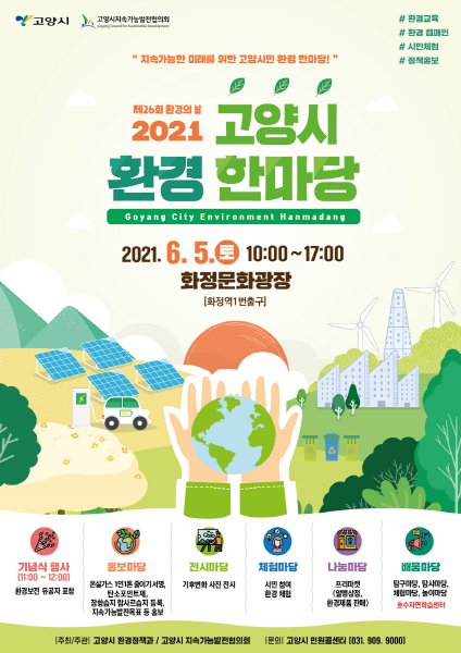 이날 화정문화광장에서는 체험마당- 저탄소 반려식물 화분 만들기, 스칸디아모스 액자만들기 등 홍보마당- COP28 고양시 유치 홍보, 온실가스 1인1톤 줄이기 서명 운동 등, 전시마당-환경사진 전시회, 나눔마당-환경관련 제품판매 등이 진행된다.