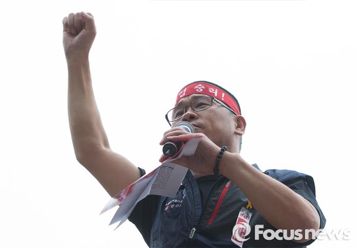 | △ 민주노총이 정부와 여당의 노동개혁을 저지하기 위해 지난 9월 23일 오후 서울 정동 경향신문사 앞에서 총파업 집회를 열었다. 집회에 참가한 한상균 위원장이 구호를 선창하고 있다. <사진제공=포커스뉴스> |