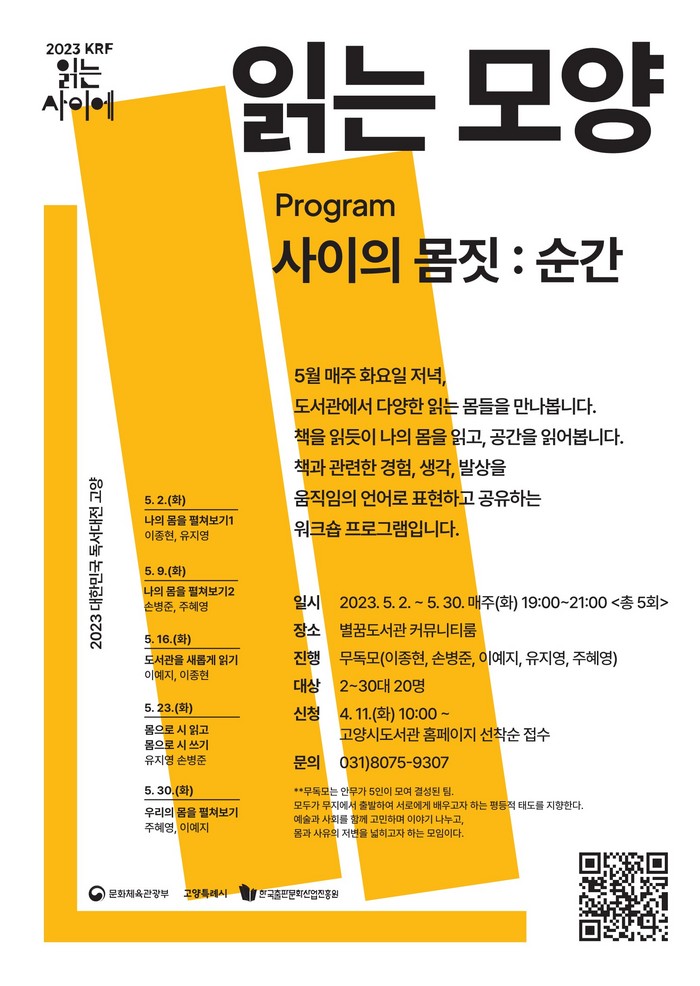 ‘읽는 모양’은 책과 관련한 경험, 생각, 발상을 움직임으로 표현하는 프로그램이다. 안무가의 도움을 받아 춤추며 책 읽기, 장소에 어울리는 자세 찾기, 개인에게 맞는 독서법 찾기 등 색다른 경험을 하는 시간이 될 예정이다.