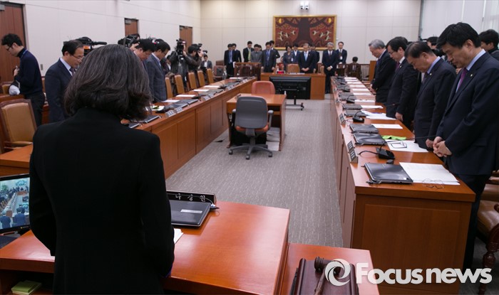 △ 지난 17일 오후 서울 여의도 국회 외교통일위원회 회의실에서 열린 프랑스 파리 테러사태 관련 간담회에 참석한 여야 의원들과 임성남 외교부 1차관이 희생자들을 추모하는 묵념을 하고 있다. <사진제공=포커스뉴스>