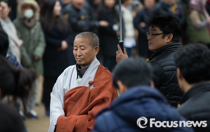 | △ 지난 10일 오전 서울 종로구 조계사에서 도법스님이 폭력 시위를 주도한 혐의로 수배된 한상균 민주노총 위원장의 자진출두 전 마지막 기자회견을 듣고 있다. <사진제공=포커스뉴스> |