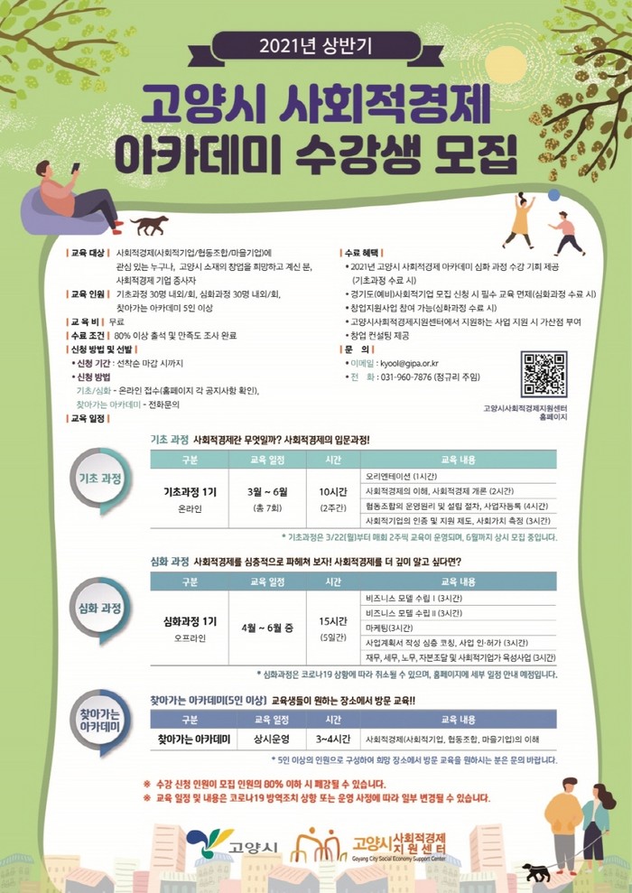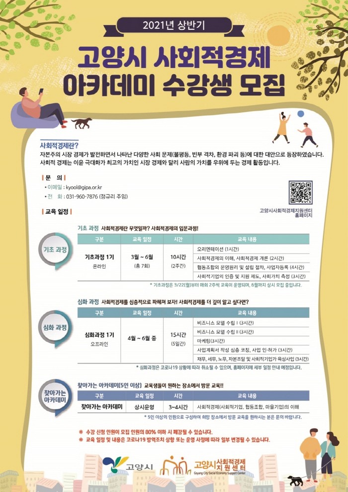 마지막으로, 찾아가는 아카데미 교육은 사회적경제에 관심 있는 5인 이상의 고양시민, 공동체, 기업 등이 신청하면 전문 강사가 직접 찾아가는 교육이다. 교육은 연중 상시 접수하며 궁금 사항은 고양시 사회적경제지원센터로 전화 문의하면 된다.