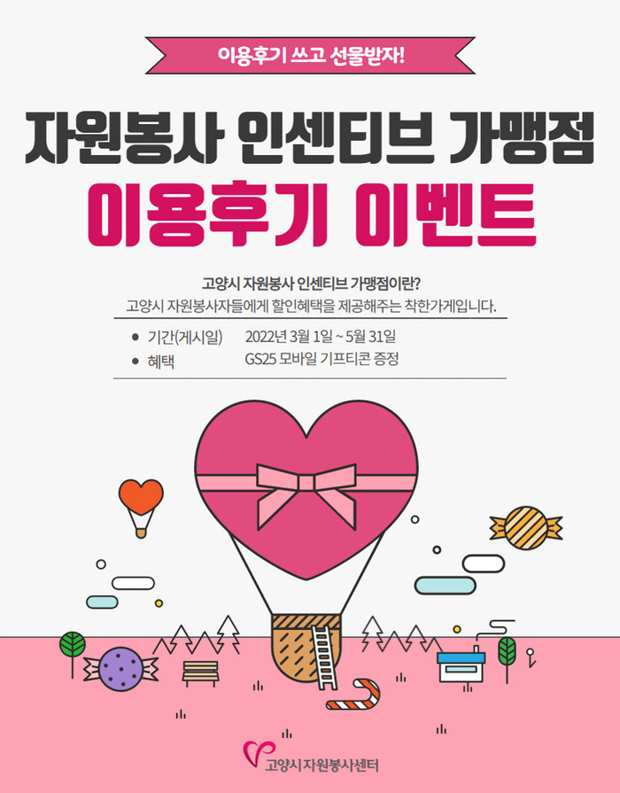 [부자동네타임즈 김인수기자] 고양시자원봉사센터(이하 센터)가 3월 1일부터 5월 31일까지“고양시 자원봉사 인센티브 가맹점 이용후기 이벤트”를 진행한다고 밝혔다.