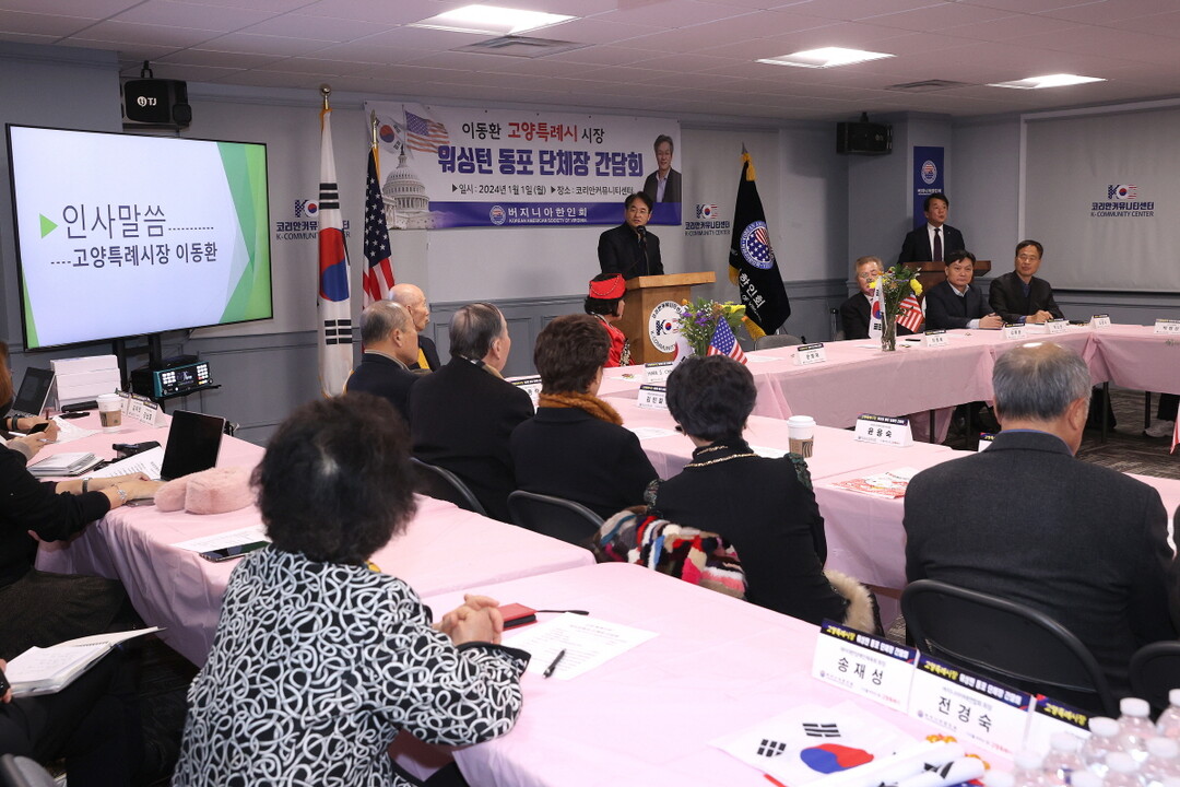 이동환 시장은 다음으로 워싱턴D.C. 코리안커뮤니티센터에서 동포단체장들과 신년간담회를 가졌다. 간담회에는 김태환 한인커뮤니티 센터장, 최태은 미주한미동맹재단 회장 등 30여 명이 참석하였으며 2024년 고양시와 한인 커뮤니티 간 협력과 소통 강화에 대해 논의했다.