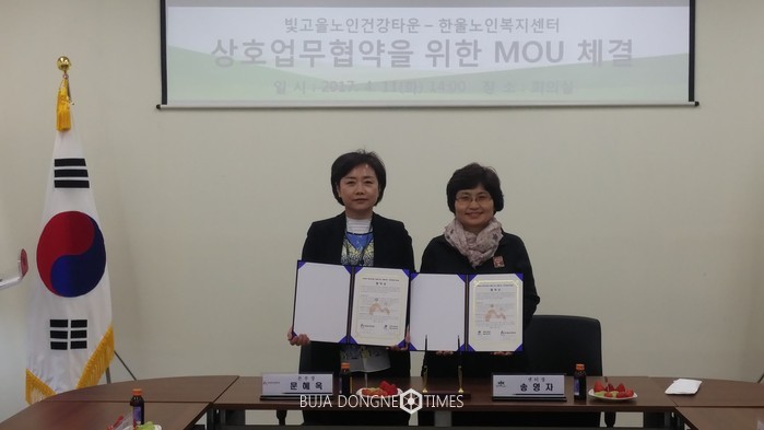 | △광주복지재단 빛고을노인건강타운은 한울노인복지센터와 지역사회를 기반으로 필요한 서비스를 제공하는 업무협약 체결했다 |