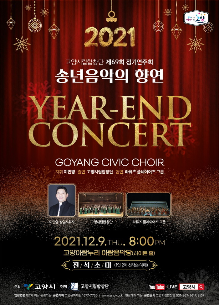 이번 고양시립합창단 제69회 정기연주회는 시민들에게 위로와 행복한 연말을 선사하고자 전석 초대로 진행된다. 예매 및 관련 문의는 고양문화재단으로, 공연문의는 고양시립예술단으로 하면 된다.