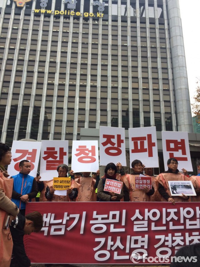 [부자동네타임즈 이영진 기자] 서울 광화문 일대에서 열린 ‘민중총궐기’ 집회에서 경찰의 과잉진압에 대한 논란이 일고 있는 가운데 농민들이 경찰의 물대포를 맞고 쓰러진 백남기(69)씨에 대한 관련 경찰 책임자 처벌과 강신명 경찰청장을 파면을 촉구했다.