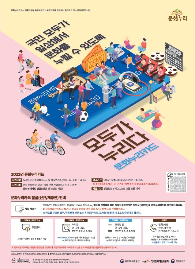 동 관계자는 "코로나19의 확산으로 대면 활동이 어려운 상황인 만큼 영화 관람, 도서 구매, 문화상품 구입 등 문화생활 혜택을 누리는 제도를 알지 못해 이용하지 못하는 사례가 없도록 이용안내 홍보와 카드발급에 최선을 다하겠다”고 말했다.