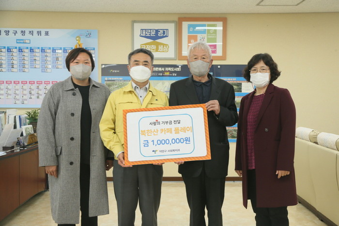 고양시 덕양구(구청장 김운영)는 "지난 3월 30일 북한산 카페 플레이에서 기부금 100만원을 전달했다."고 밝혔다.