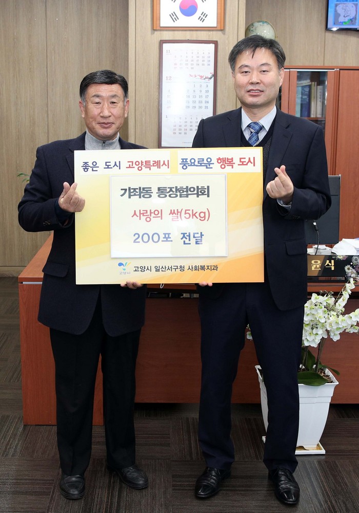 정윤식 일산서구청장은 “가좌동 통장협의회의 온정의 손길에 깊은 감사를 드리며, 후원해 주신 쌀은 일산서구 관내 11개 동 저소득 가구에 소중히 전달하겠다.”며“앞으로도 지역 공동체와 함께 취약계층을 위한 다양한 나눔을 실천하는데 노력하겠다.”고 전했다.