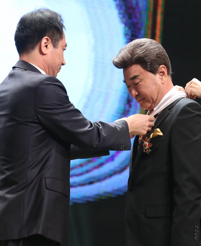 △ 배우 이덕화가 29일 오후 2시 국립극장 해오름극장에서 열린 '2015 대한민국 대중문화예술상' 시상식에서 은관문화훈장을 수상하고 있다. <사진제공=문화체육관광부>