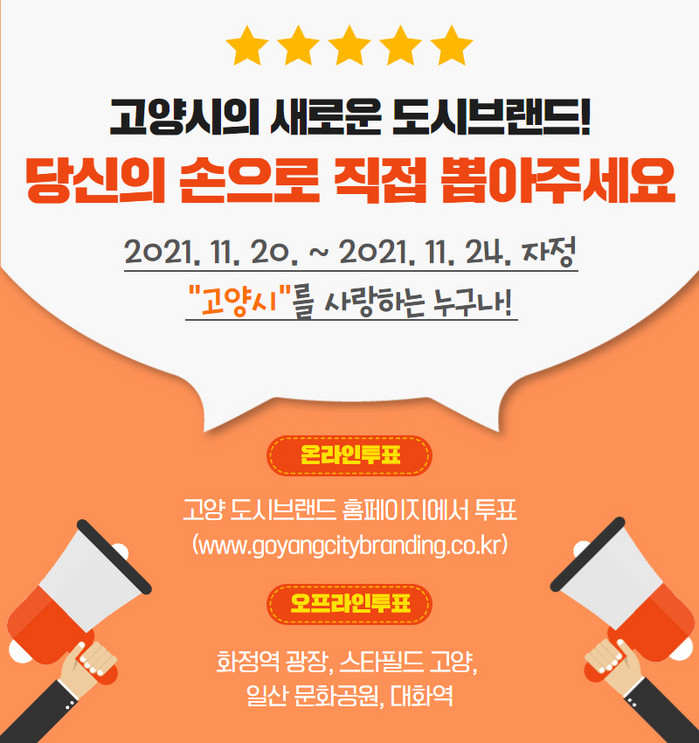 오프라인 투표는 화정역, 스타필드 고양, 일산 문화공원과 대화역에서 진행된다. 온라인 투표는 고양시 도시브랜드홈페이지에서 할 수 있다.