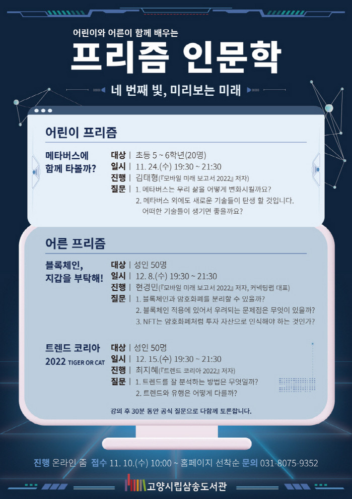 [부자동네타임즈 김인수기자] 고양시 삼송도서관이 ‘미리 보는 미래’라는 주제로 11월 24일부터 12월 15일까지 올해의 마지막 ‘프리즘 인문학’을 운영한다.