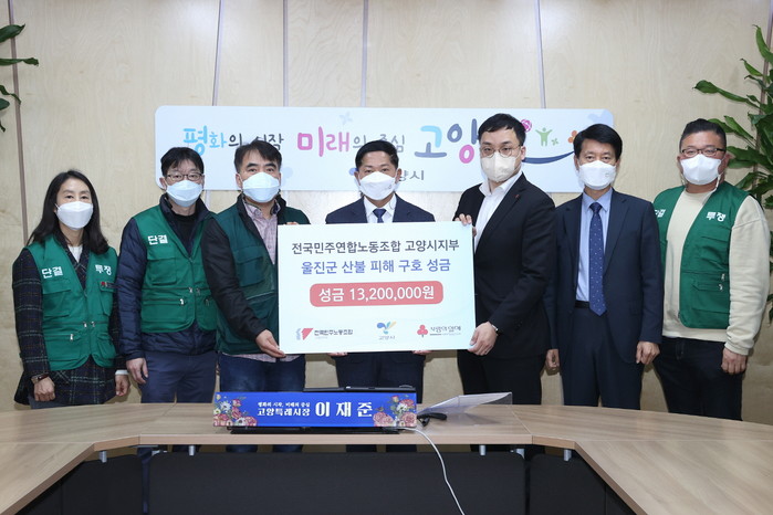 [부자동네타임즈 김인수기자] 고양시는 지난 14일 전국민주연합노동조합 고양시지부(지부장 곽승율)가 울진군 산불 피해 이재민 지원을 위해 성금 1,320만 원을 기부했다고 밝혔다.