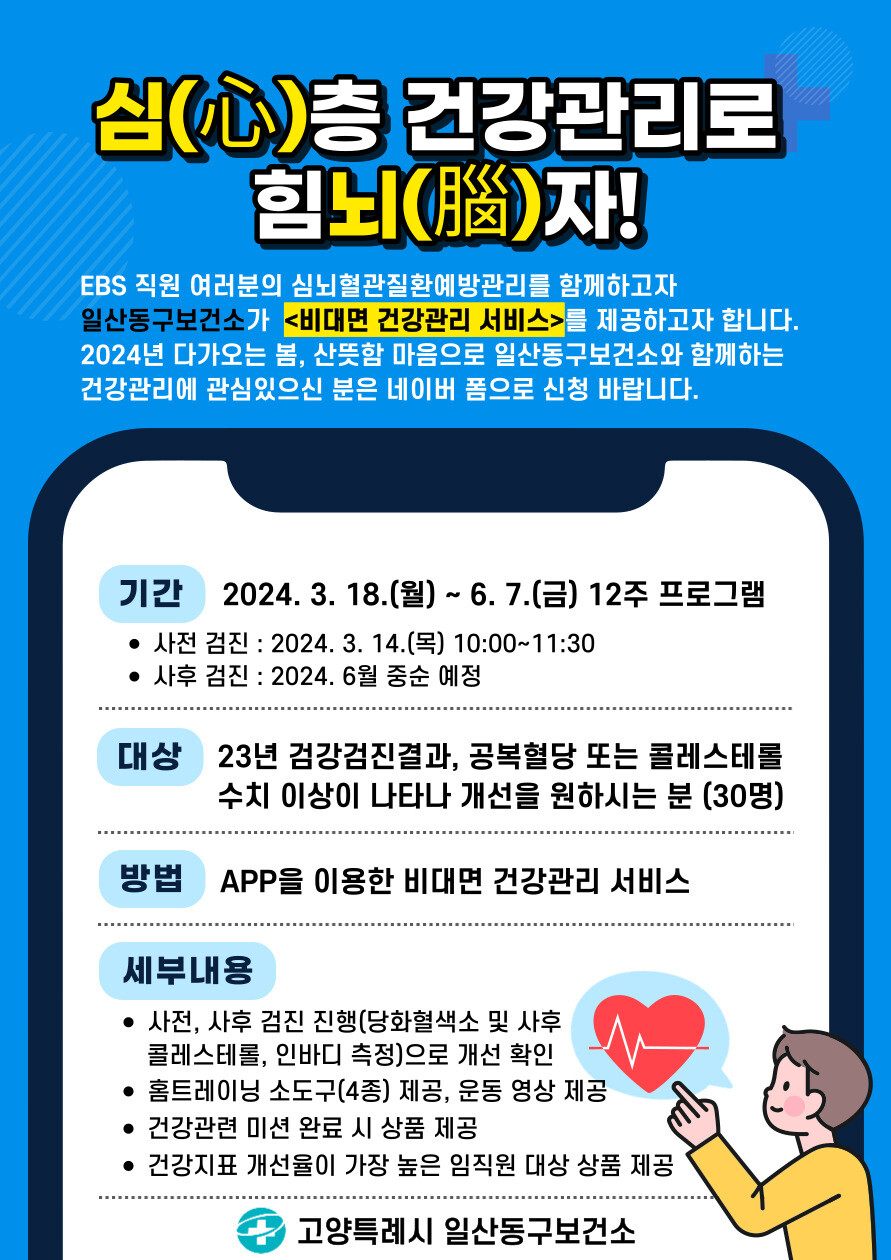 [부자동네타임즈 = 김인수 기자] 고양특례시 일산동구보건소는 2024년 상반기 직장인 대상 비대면 심뇌혈관질환예방관리 사업을 중점 운영한다고 8일 밝혔다.