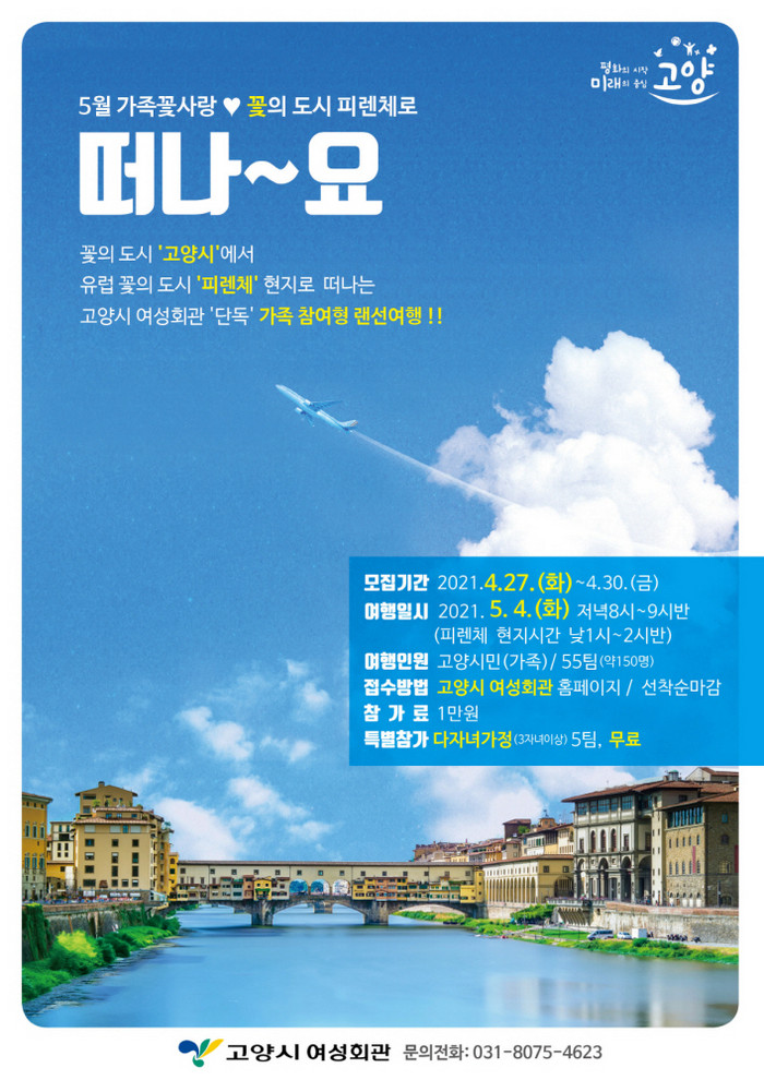 [부자동네타임즈 김인수기자] 고양시 여성회관은 이탈리아 피렌체로 떠나는 랜선 여행 프로그램을 실시, 27일부터 참가자를 모집한다.