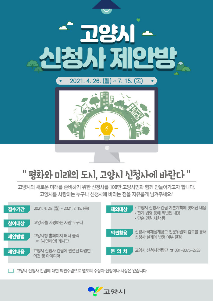 시는 ‘고양시 신청사 제안방’에서 시민들에게 구체화된 신청사 건립 사업에 대한 정보를 제공한다. 또한, 시민들의 다양하고 자유로운 의견을 듣고 아이디어 제안을 받아 신청사 설계에 반영할 예정이다. 이를 통해 신청사를 시민개방 복합 문화·복지공간으로 만들어, 지역의 랜드마크 및 시민친화형 공간으로 건립할 계획이다.