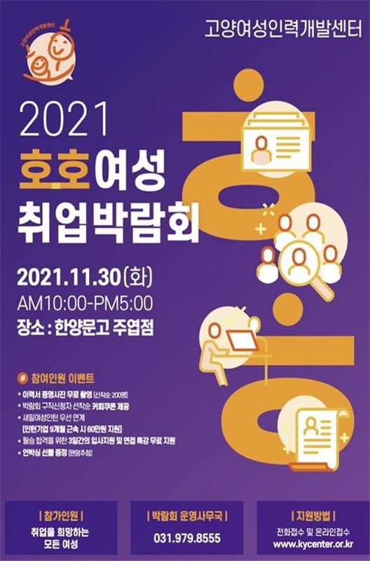 [부자동네타임즈 김인수기자] 고양시와 고양여성인력개발센터(관장 유혜림)가 여성 구직자와 경력단절 여성의 취업지원을 위해 ‘호호여성취업박람회’를 11월 18일부터 11월 30일까지 개최한다.
