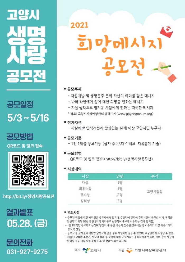 자살예방 인식을 개선에 관심 있는 14세 이상 고양시민이면 누구나 참여할 수 있다. 응모작 접수는 QR코드 및 구글 설문지(bit.ly/생명사랑공모전)를 통해 하면 된다.