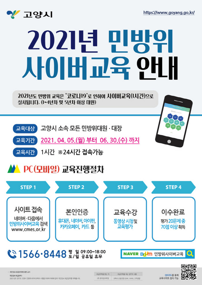 이번 사이버교육은 민방위대원 등 6만여 명을 대상으로 실시하며, 연차에 상관없이 1시간만 이수하면 된다.