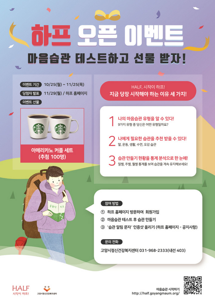 [부자동네타임즈 김인수기자] 고양시 정신건강복지센터가 25일 마음습관 관리 프로그램 ‘하프’ 운영을 기념해 오픈 이벤트를 연다.