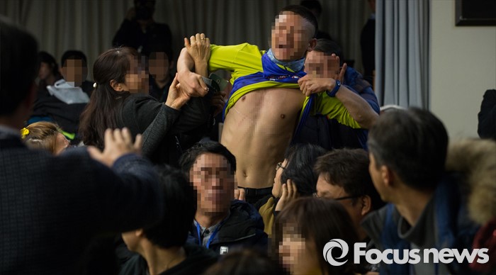 (서울=포커스뉴스) 14일 오후 서울 중구 서울YWCA에서 열린 '4·16세월호참사 특별조사위원회 제1차 청문회'에 참가한 세월호 생존자 김동수 씨가 날카로운 물체를 이용해 자해를 하고 있다.