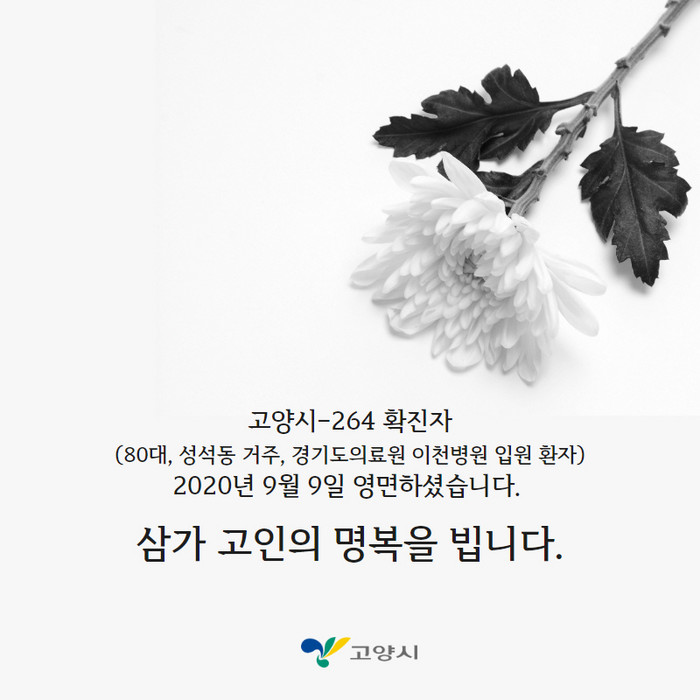 한편, 시는 지난달 31일 확진판정을 받은 고양시 264번째 확진자 B씨가 9일 오전 사망했다고 밝혔다. 80대인 B씨는 일산동구 일이삼요양원 입소자로 경기도 이천병원에서 사망했다.