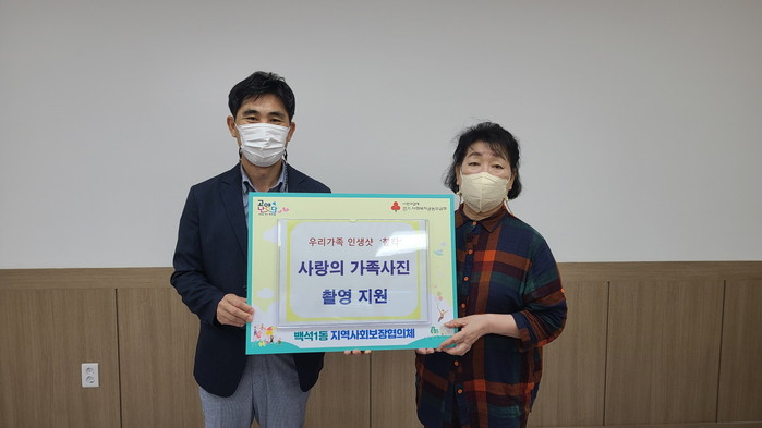 백석1동 지역사회보장협의체는 경제적인 어려움, 개인적 여건 등을 이유로 가족사진 촬영이 어려운 저소득 한부모 가족을 위해 가족이 함께하는 행복한 추억을 만드는 가족사진 촬영권을 10가구에 전달했다.
