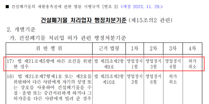 오늘 홍 의원이 추가로 공개한 자료에 따르면, 건설폐기물의 재활용촉진에 관한 법률 시행규칙에 따른 건설폐기물처리업자 행정처분기준에서는 "법 제21조제5항에 따른 조건을 위반한 경우"에 "법 제25조제2항제9호" 규정을 근거로 1차 영업정지 1월, 2차 영업정지 3월, 3차 영업정지 6월, 4차 허가취소를 하도록 규정하고 있다.