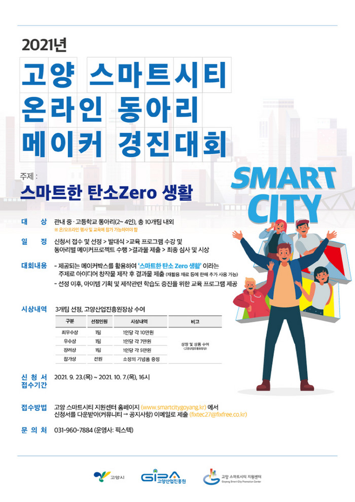 [부자동네타임즈 김인수기자] 고양시와 고양산업진흥원은 고양시 중·고등학교 동아리 학생들을 대상으로 ‘스마트한 탄소 Zero 생활’이라는 주제로‘2021년 고양 스마트시티 온라인 동아리 메이커 경진대회’를 비대면으로 개최한다.