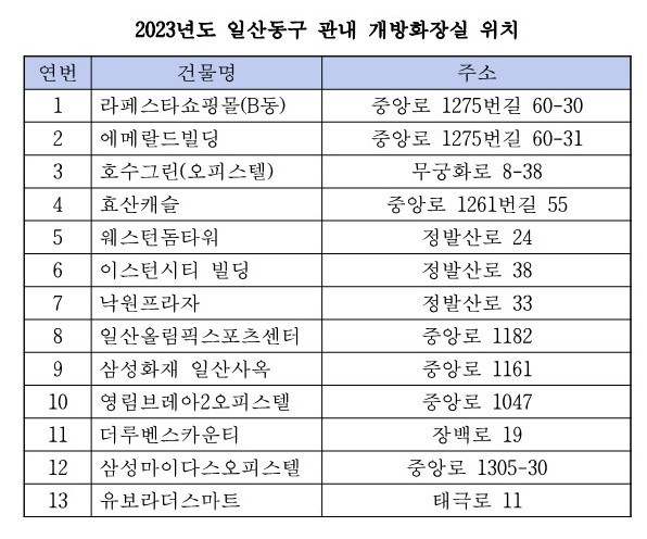 [부자동네타임즈 김인수기자] 고양특례시 일산동구는 시민 편의 증진을 위해 ‘개방화장실’을 지정하고자 작년 12월 7일부터 21일까지 지정 신청·접수를 진행했고, 총 13개의 개방화장실을 지정했다고 밝혔다.