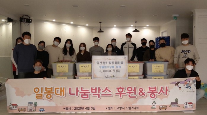 이날 ‘일봉대’ 회원은 “코로나19 장기화로 인해 힘든 생활을 보내고 있는 아동들에게 조금이나마 도움이 되기를 바라는 마음으로 회원들과 힘을 모았다”며 “저소득층 아동들에게 따뜻한 나눔을 실천하고 있는 고양시 드림스타트에게 앞으로도 지속적인 도움을 드리고 싶다”는 뜻도 함께 밝혔다.