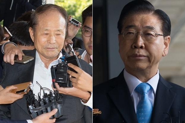 | △ 서울중앙지검에 모습을 드러낸 이상득(80·왼쪽) 전 의원과 정준양(67) 전 포스코그룹 회장. <사진=포커스뉴스 DB> |