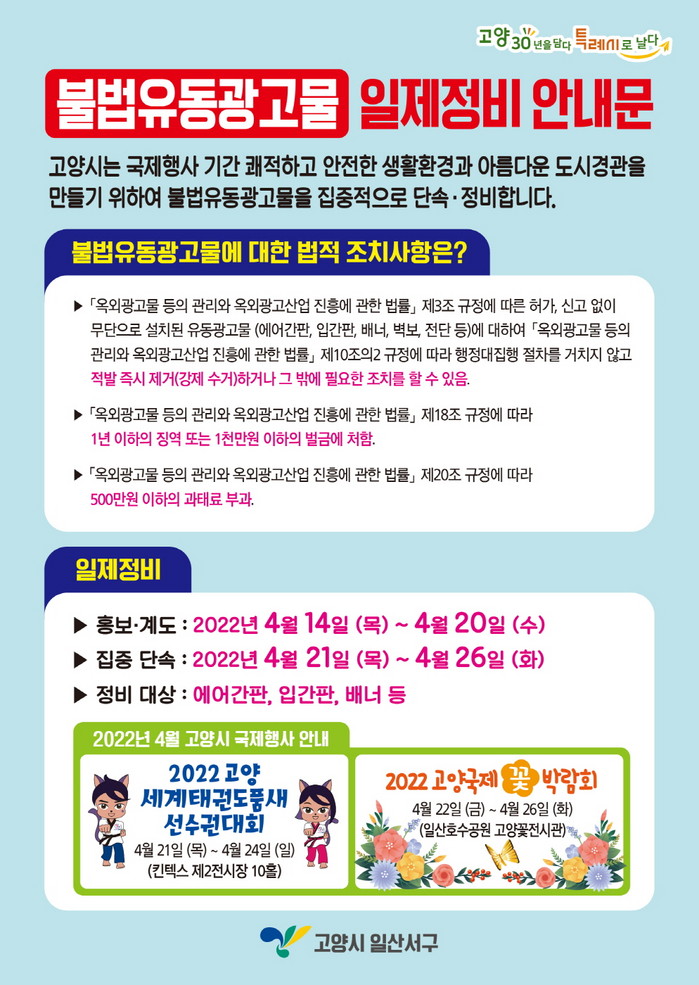 구 관계자는 “도시미관을 해치고 시민들에게 불편을 주는 불법광고물을 집중 정비하고, 상습 불법 행위자에 대해서는 행정 처분 조치를 통해 불법광고물을 근절해 고양시민뿐만 아니라 고양시를 찾는 모든 분들에게 깨끗하고 쾌적한 도시환경을 제공하겠다”고 말했다.
