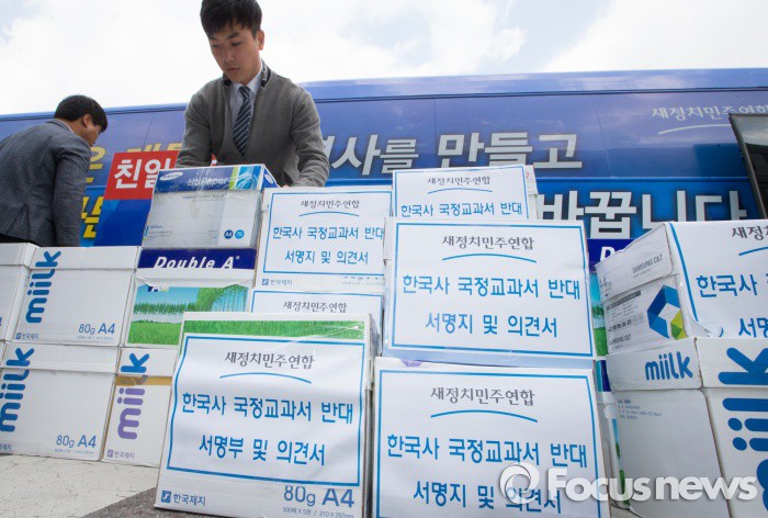 (세종=포커스뉴스) 2일 오후 세종시 정부세종청사 교육부 앞에서 새정치민주연합 당직자들이 한국사 국정교과서 반대 서명지 및 의견서를 쌓고 있다. 이날 도종환, 유인태, 박홍근 새정치민주연합 의원들이 교육부에 한국사 국정교과서 반대 서명서 및 의견서를 전달했다.