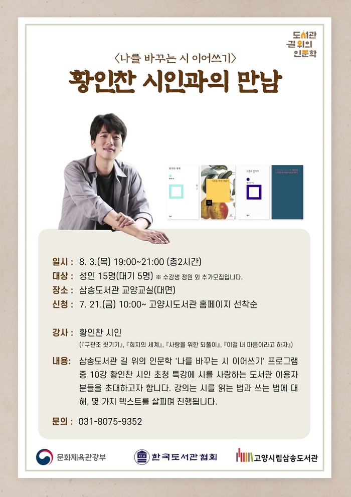 [부자동네타임즈 김인수기자] 삼송도서관은 오는 8월 3일 황인찬 시인을 초청해 특강 ‘나를 바꾸는 시 이어쓰기’를 운영한다.