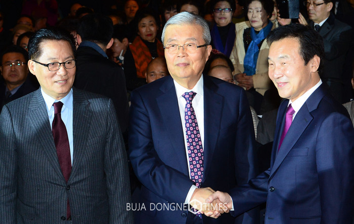 손학규(오른쪽) 전 민주당 대표가 22일 오후 서울 종로구 세종문화회관에서 열린 '국민주권개혁회의' 출범식에 참석해 더불어민주당 김종인(가운데) 전 비상대책위원회 대표와 악수를 하고 있다. 2017.01.22.
